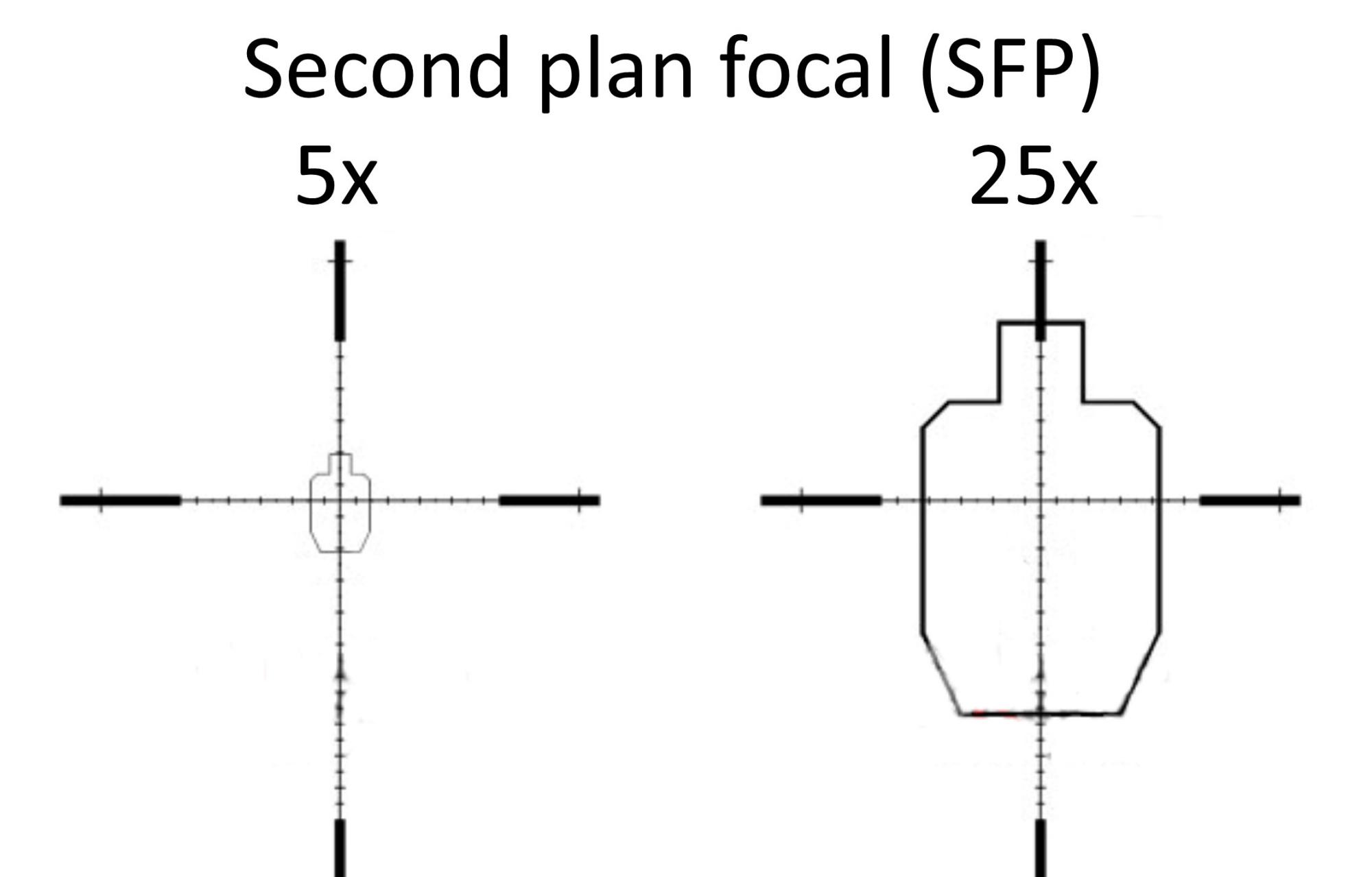 Tandis qu'avec un second plan focal le réticule à une dimension fixe et la cible grossit indépendamment du réticule. Il faut donc connaître à quel niveau de grossissement nous pouvons faire les relevés de mesures pour être fiable.